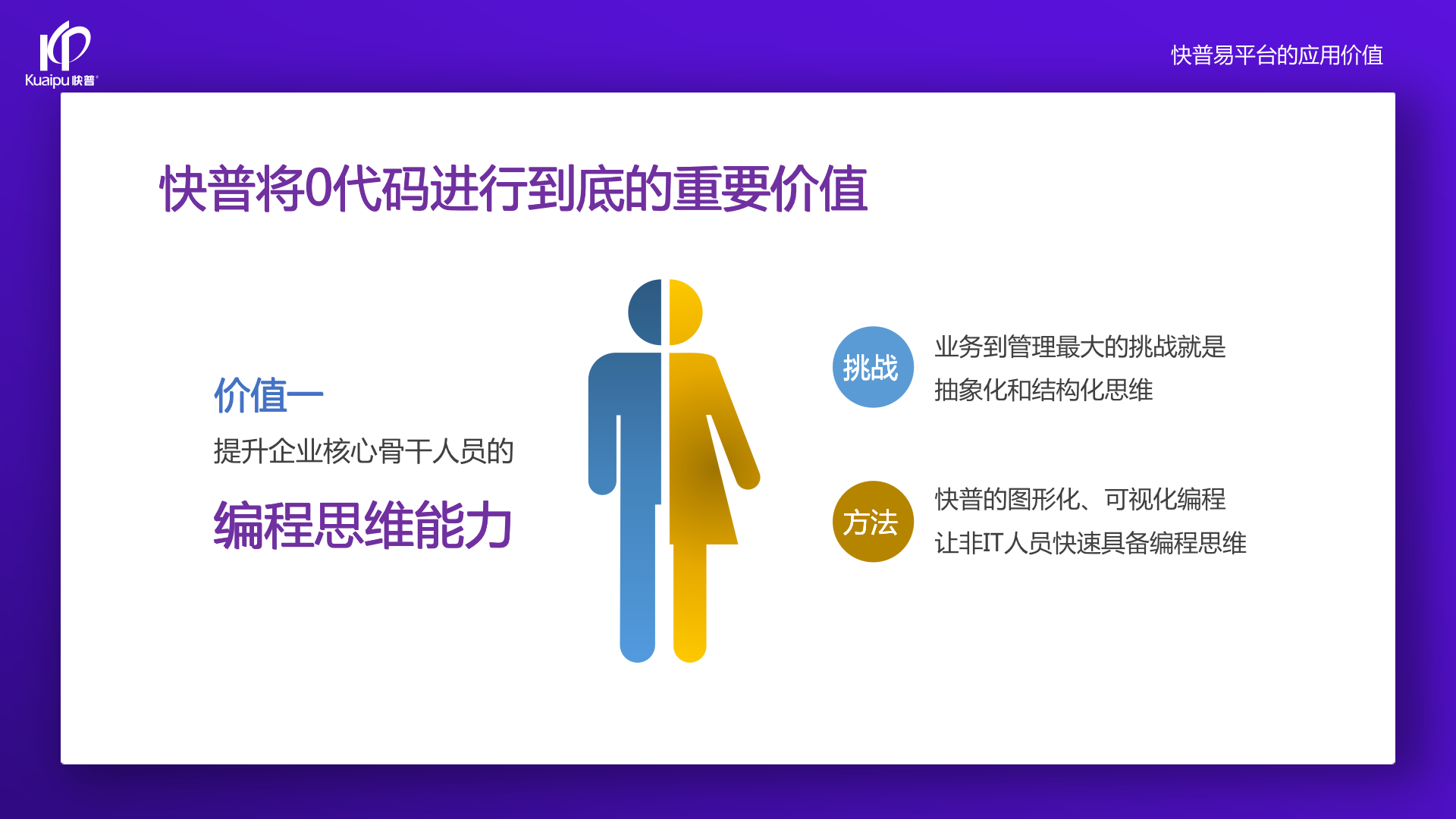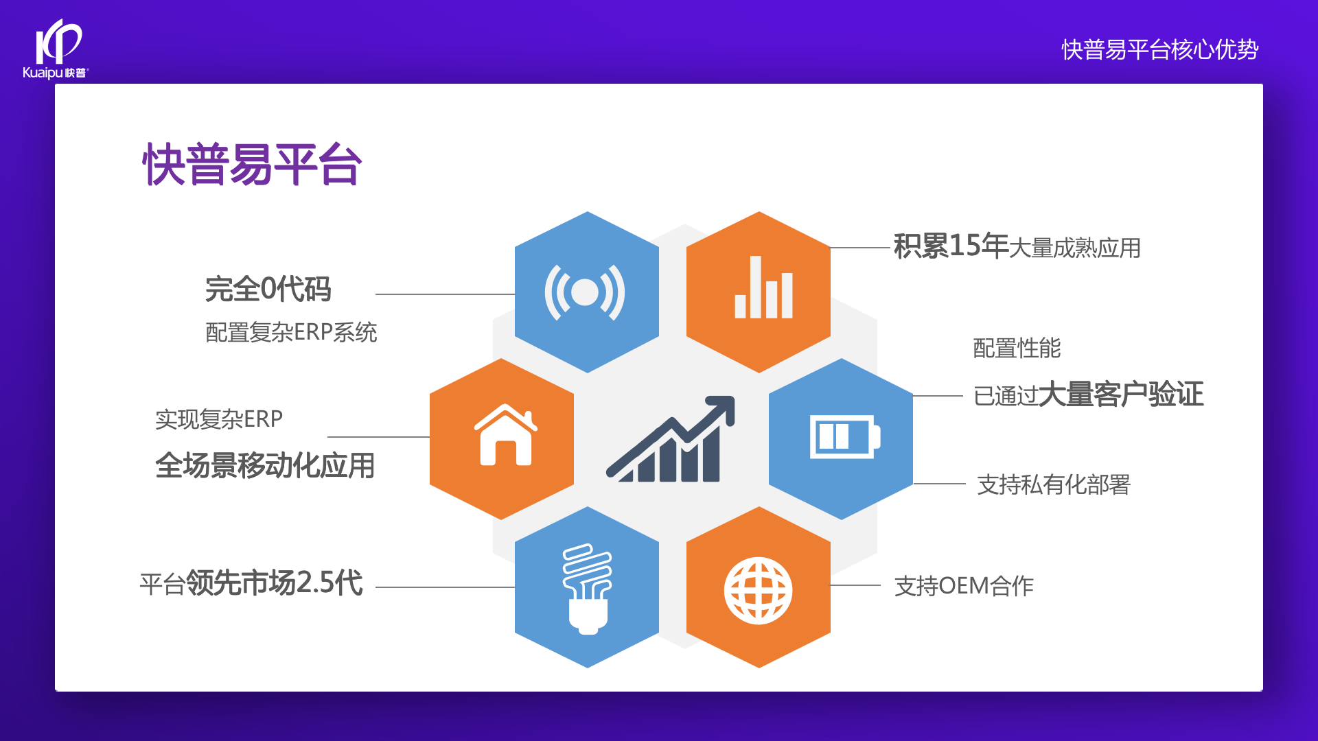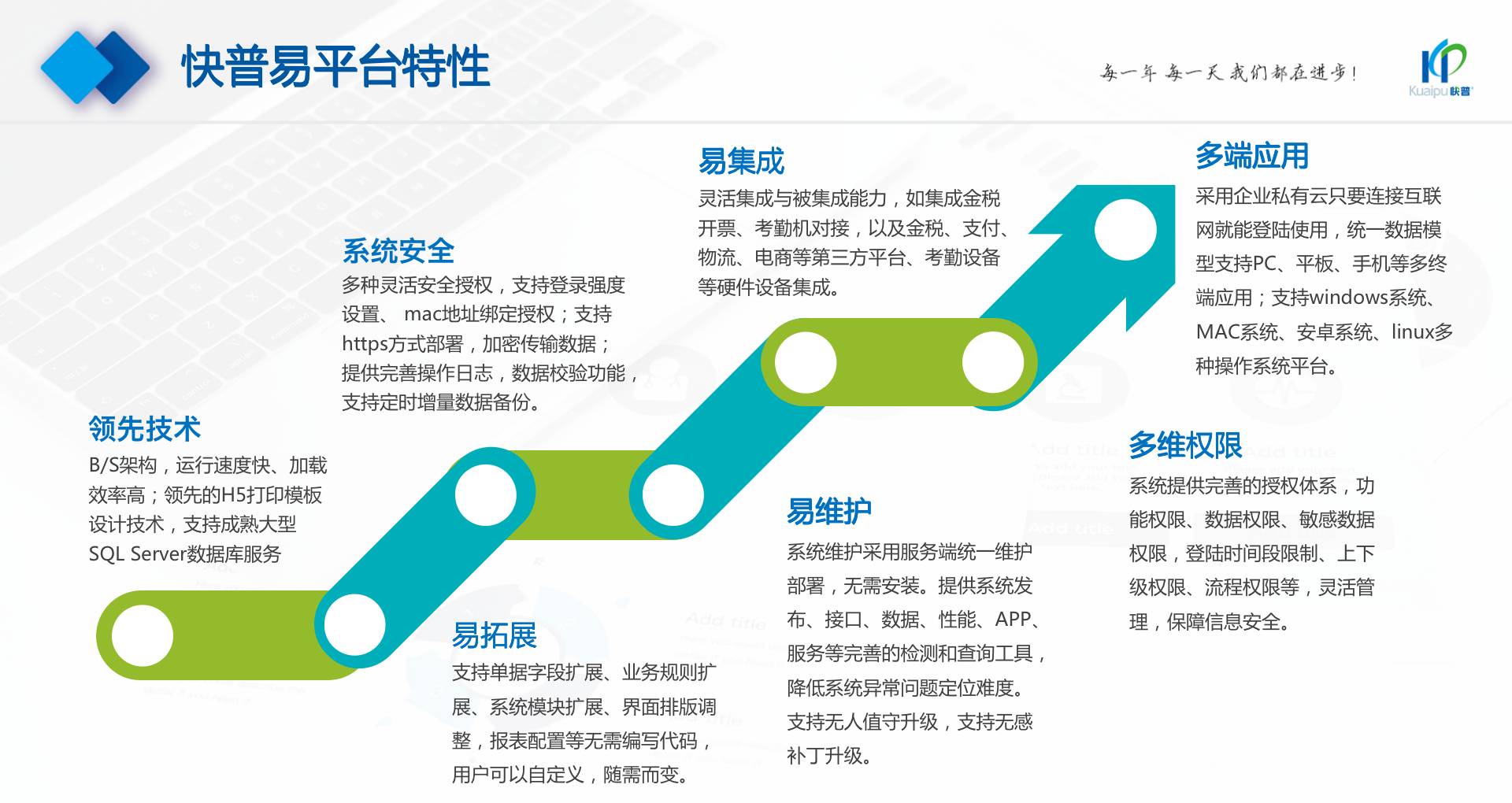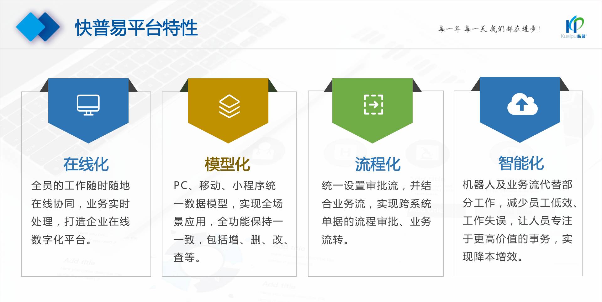 為了解決市場需求與平臺產(chǎn)品瓶頸等矛盾,實現(xiàn)徹底的零代碼平臺,快普堅持理念創(chuàng)新,以理念推動平臺技術(shù)的創(chuàng)新?!耙圆蛔儜?yīng)萬變”的理念:分析哪些東西未來肯定不變?哪些趨勢未來一定會變?從變化中找出不變的因素,從不變中找出變動的因素;從量變到質(zhì)變,經(jīng)歷萬變總結(jié)抽象出不變的本質(zhì)?;诳炱臻L期的信息化服務(wù)經(jīng)驗,開發(fā)配置出企業(yè)數(shù)字化轉(zhuǎn)型工具:快普易平臺成功解決了企業(yè)數(shù)字化轉(zhuǎn)型升級面臨的客戶大量個性化需求,真正實現(xiàn)隨需而變的設(shè)計理念,大大降低了信息化投入成本,提高信息化效率,幫助企業(yè)實現(xiàn)自主可控的技術(shù)創(chuàng)新,從而進(jìn)一步推動企業(yè)的業(yè)務(wù)創(chuàng)新和管理創(chuàng)新。