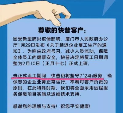 公司第一時(shí)間發(fā)布服務(wù)公告:未正式返工期間,快普將為客戶(hù)提供7*24h服務(wù),客戶(hù)可通過(guò)遠(yuǎn)程方式獲取運(yùn)維及項(xiàng)目實(shí)施等服務(wù)。