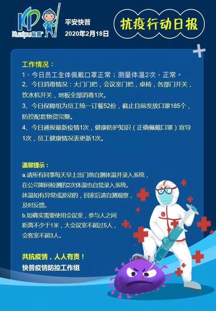 快普疫情防控工作組堅(jiān)持“查、防、控”三大原則,嚴(yán)格遵循制度、規(guī)范開展工作,兢兢 業(yè)業(yè),全員上下一心,共同建設(shè)“平安快普”。