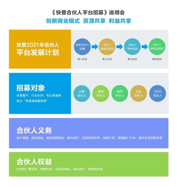 快普合伙人平臺(tái)將依托快普整合管理、專注細(xì)分行業(yè)與強(qiáng)大的技術(shù)平臺(tái)支持三大優(yōu)勢(shì),面向各行各業(yè)招募合伙人,通過多種合作形式,建立“快普落地服務(wù)商”,幫助全國更多企業(yè)實(shí)現(xiàn)信息化轉(zhuǎn)型,提高企業(yè)的技術(shù)創(chuàng)新能力與品牌價(jià)值。
