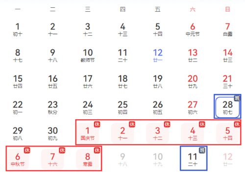 放假調(diào)休安排如圖所示: “藍(lán)色框”為補(bǔ)班時間、“紅色框”為放假時間